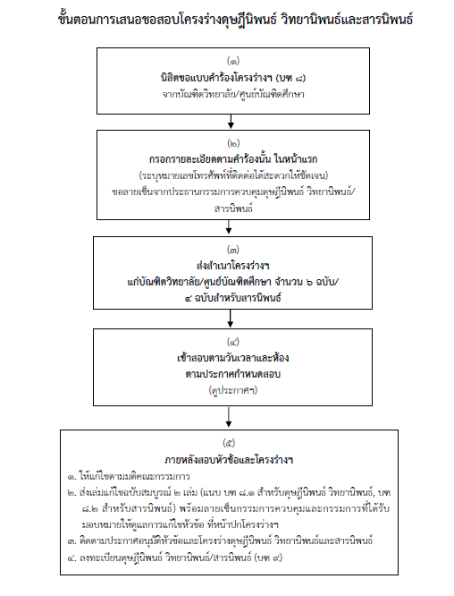 กรอกรายละเอียดให้ครบถ้วนแล้วนำเสนอขอความเห็นชอบจากผู้สมควรเป็นประธานกรรมการควบคุมดุษฎีนิพนธ์ วิทยานิพนธ์และสารนิพนธ์